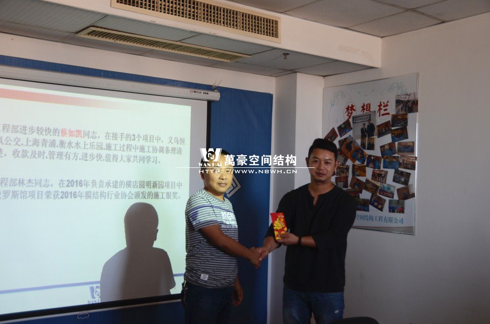 2017年7月,在工程部經(jīng)理的組織帶領(lǐng)下,公司工程部成功舉辦年中總結(jié)計(jì)劃會(huì)議,工程部經(jīng)理對(duì)上半年的工作做了總結(jié),也提出了下半年的工作計(jì)劃,得到張總的認(rèn)可,會(huì)議最后著重表?yè)P(yáng)了工程部蔡如凱同志和林杰同志。