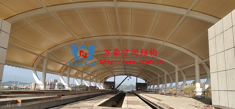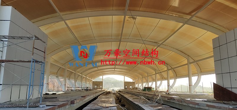清遠(yuǎn)磁懸浮項(xiàng)目蓮湖車站鋼-膜結(jié)構(gòu)工程位于廣東省清遠(yuǎn)市,用鋼量200噸,膜結(jié)構(gòu)展開面積5200平米,由寧波萬(wàn)豪空間結(jié)構(gòu)工程有限公司承建。