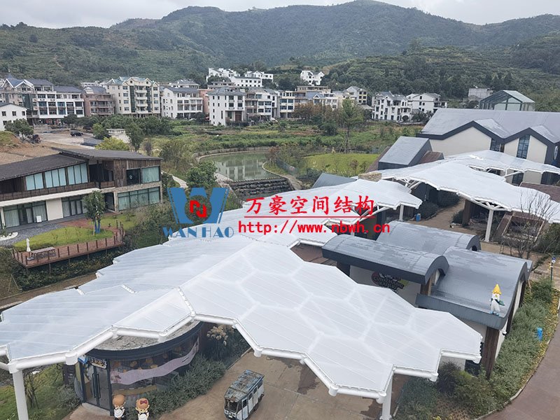 樂清鐵定溜溜樂園膜結構工程位于浙江省溫州市樂清市,項目鋼膜結構雨棚包括6號商業街蜂窩狀ETFE膜結構、檢票口PTFE膜結構、售票口PVDF膜結構。