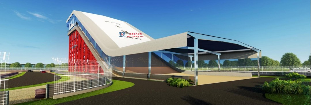 比亞迪紹興嵊州賽車場以極速競技與自然景觀的融合為設計核心,干拔沙坡觀景平臺作為賽道的標志性節點,同時滿足了功能性、標志性與生態協調性。設計靈感來源于賽車疾馳時揚起的沙浪與風動軌跡,通過鋼結構的剛性骨架與膜材的柔性質感,塑造出如沙丘起伏般的動態形態,既呼應賽車場的速度美學,又為觀眾提供遮陽避雨的舒適空間。該項目PTFE膜屋面展開超3萬平方米。