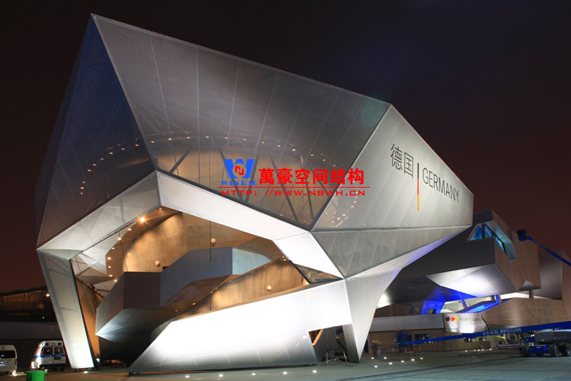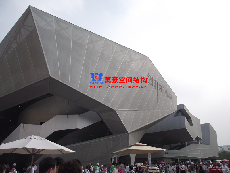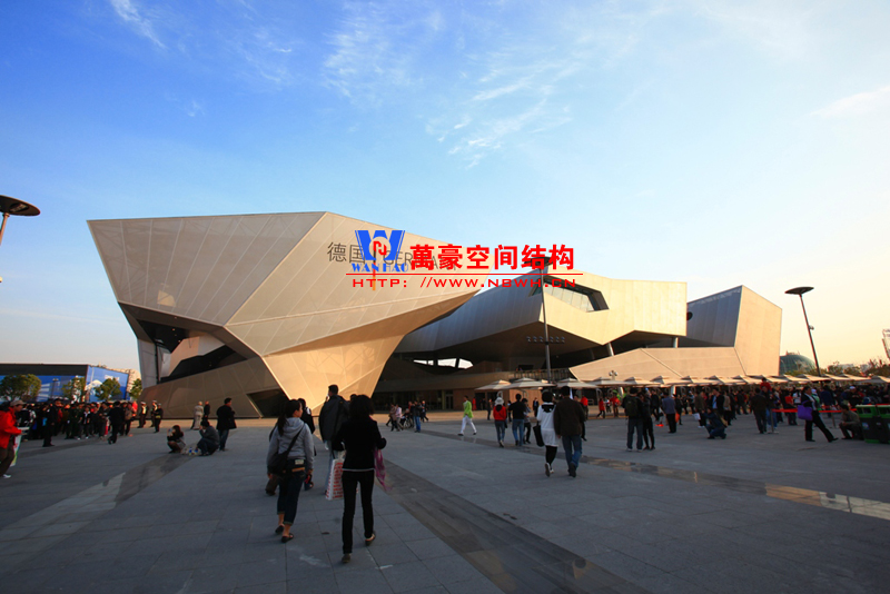 世博會德國館膜結構建筑建成于2009年7月,于2010年在中國上海世博會上正式投入使用,是中國國內經典膜結構建筑之一。德國館位于盧浦大橋附近的黃浦江南岸,與瑞士、法國和波蘭館相鄰,占地面積6000平方米。由于膜結構材料的特殊屬性,可以讓德國館的形態呈不規則狀,十分的別致。展館四面呈開放狀,其建筑設計給人一種輕盈、飄逸的感覺,又像是在邀人同游。德國館的建筑體外部由一層透明的銀色發光建筑膜結構包裝起來,展館的四大建筑主體懸架于和諧都市展廳入口所在的底層區域。