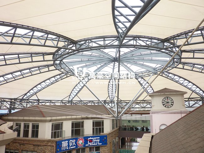 工程位于蕭山開元廣場商業購物中心,整體工程采用骨架穹頂結構,屋面直徑為50米,總面積約6000平方米,屋蓋體系脈絡清晰流暢,造型簡潔有力,力圖體現結構與材料的自身美感,精致的鋼架,潔白的膜材,賦予建筑高技派和未來主義色彩。