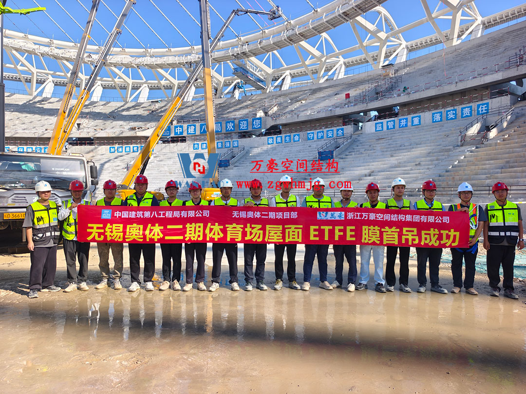 該項目采用車輻式索膜結構體系,其中膜結構由屋面內環ETFE氣枕結構、屋面外環PTFE膜結構及立面PTFE膜結構組成。 其中,屋面ETFE氣枕由萬豪空間結構深化設計及安裝,ETFE氣枕投影面積20000平方米左右。